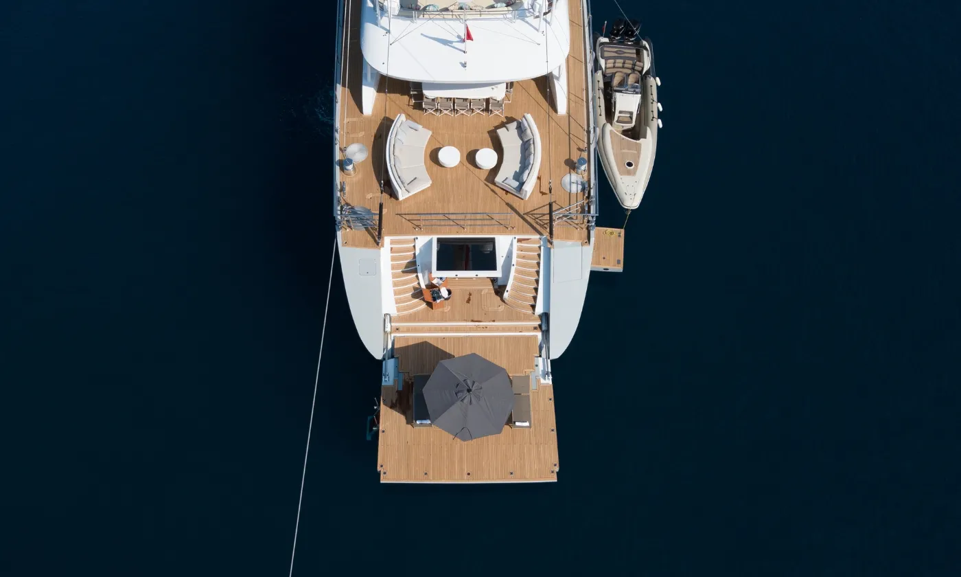 A bright, airy, and elegant interior combined with a roomy sundeck creates the ultimate ambiance. Queen of Salmakis' deck features a jacuzzi and two smaller tables with a padded seating area. The is also a shaded outdoor bar with a large dining table, perfect for a spectacular dinner under the stars.