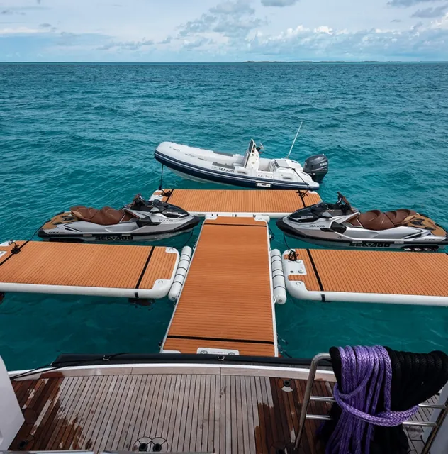2 SeaDoo Jet skis, 2 Sea Bobs, 2 Water Skis, 2 Wake Boards, Inflatable Tube ride, Kneeboard, Inflatable Big Slice Tube, Inflatable 8 person Fiesta Party Raft, Inflatable Teak Docking System with 2 loungers, Snorkel Gear, 2 Tenders