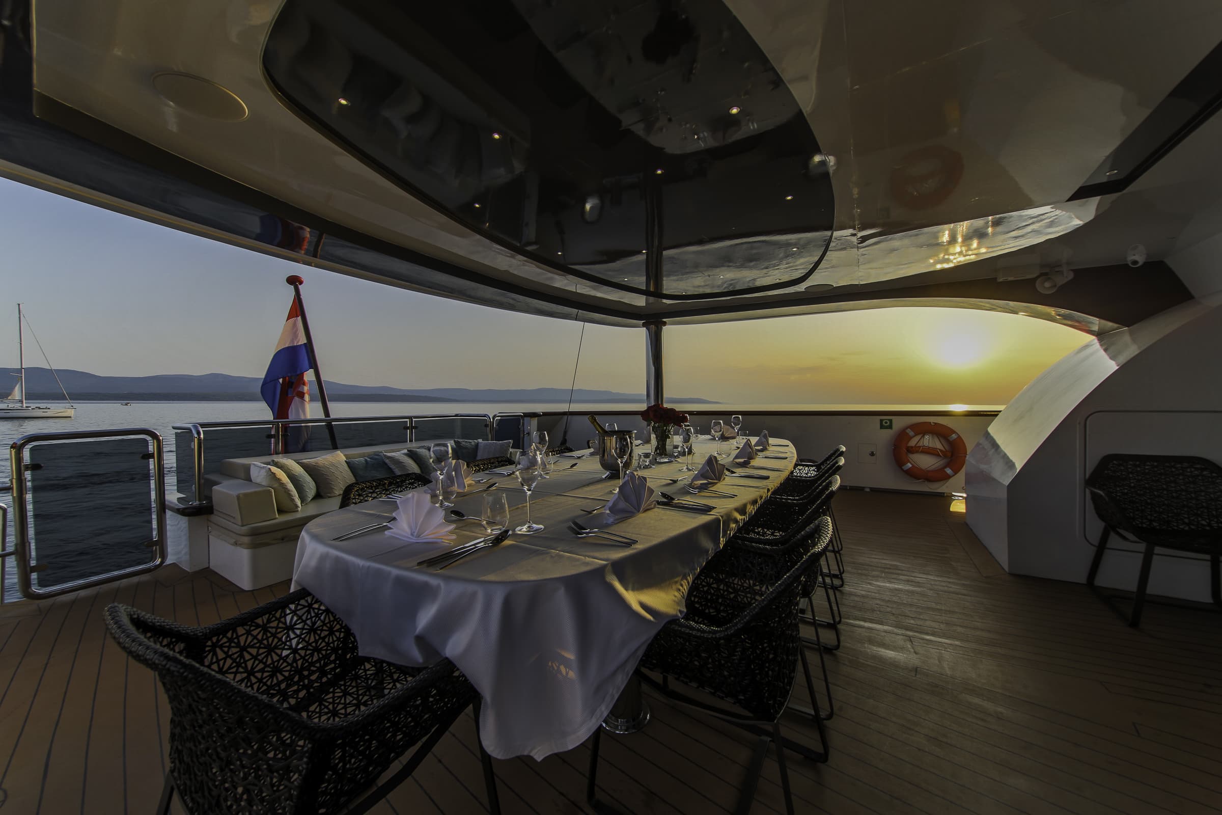 Smoking is permitted only on exterior decks and on some yachts, only in specifically designated outdoor areas. For safety reasons, smoking is strictly prohibited inside the yacht. The crew will explain the designated smoking areas during the safety briefing at embarkation.