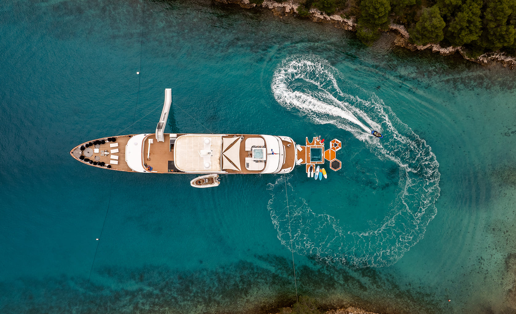 For guests who love both relaxation and adventure, the yacht offers an exceptional range of water toys including Jet Skis, SeaBobs, paddleboards, an E-Foil, floating platforms and a waterslide. You’ll also find plenty of floaties and snorkeling gear for exploring the sea, while the elegant tender ensures every transfer is smooth and effortless.