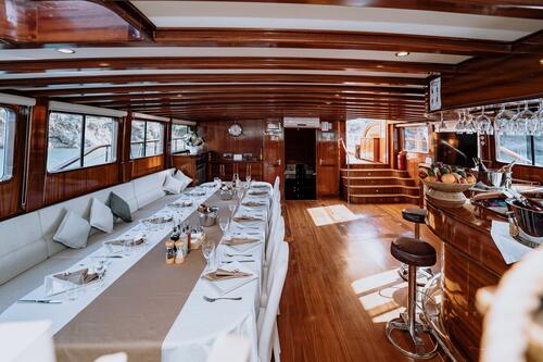 Her vast saloon affords plentiful space for the entire group to eat in style if the weather requires indoor dining, or simply to enjoy a seat at your own private bar for cocktails or a quiet nightcap.